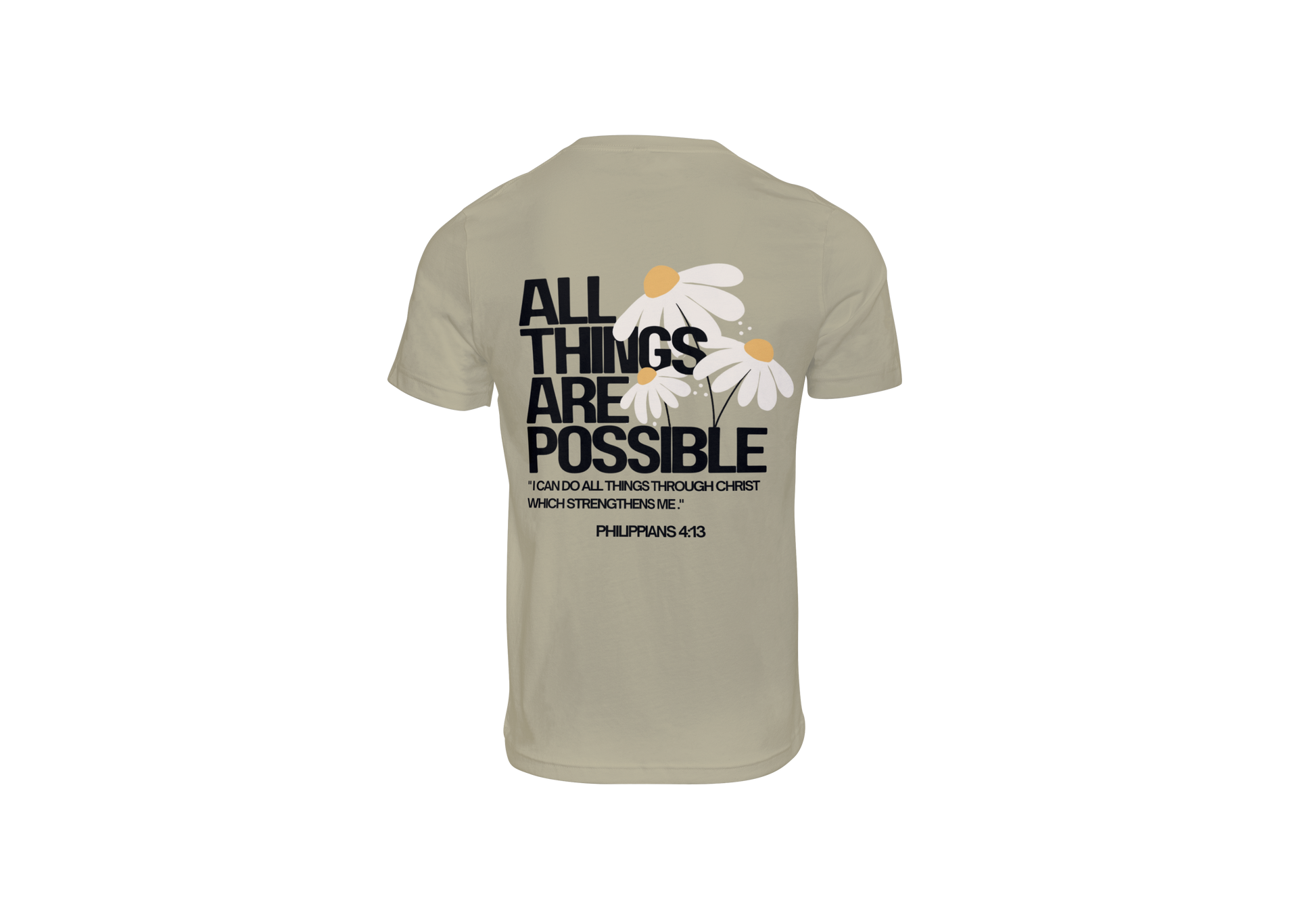 Introducing our brand new "All Things Are Possible" T-Shirt—now available for pre-order! Available in four stunning new colors, this stylish piece is more than just fashion; it's a statement of faith. With God, all things are possible, so wear your beliefs proudly and inspire those around you. Don’t miss out—order yours today and share your faith in style!